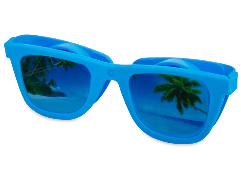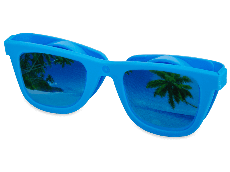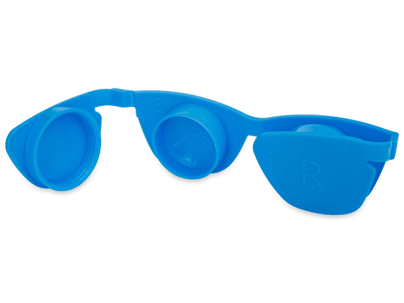 Vtipné plastové pouzdro na kontaktní čočky ve tvaru slunečních brýlí. Víčka jsou k pouzdru připevněna „stranicemi“ brýlí a nešroubují se. Víčka kalíšků mají klasická rozlišovací písmena R a L. Motiv na modrém pouzdru ve tvaru brýlí je tropická pláž s palmami.